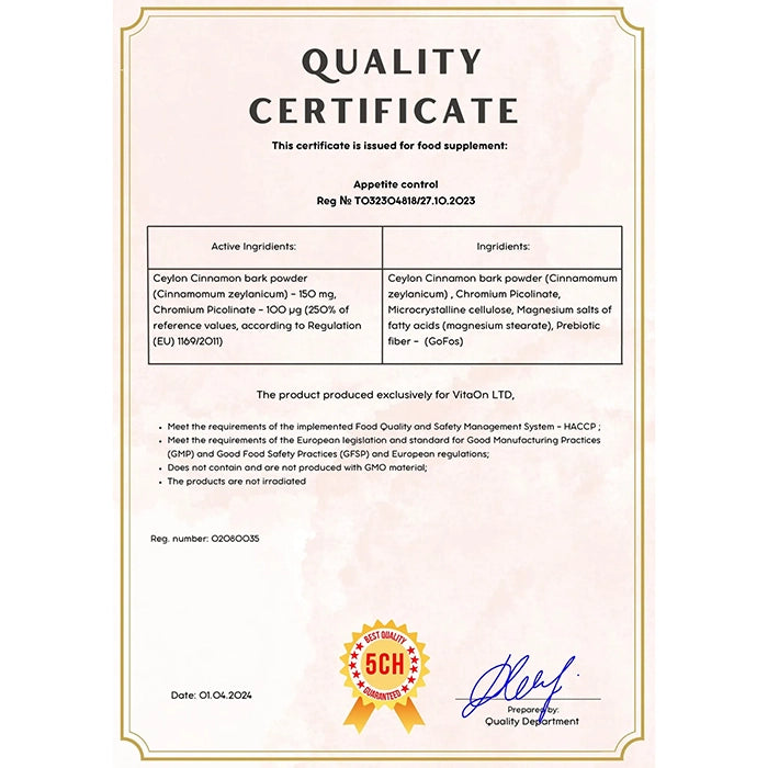Zaufanie naszych klientów jest naszym najwyższym priorytetem. Dlatego nasz „Appetite Control” jest produkowany zgodnie ze standardem Dobrej Praktyki Produkcyjnej (GMP) – złotym standardem w branży. Gwarantuje to ścisłą kontrolę na każdym etapie – od wyboru surowców po produkt końcowy. Dodatkowo, jako gwarancję autentyczności i bezpieczeństwa, produkt zarejestrowano w Agencji Bezpieczeństwa Żywności pod numerem rejestracyjnym T032304818.