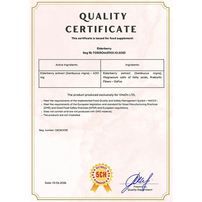 Zaufanie naszych klientów jest priorytetem. Dlatego ekstrakt z Czarnego bzu od VitaOn został wyprodukowany zgodnie ze standardem Dobrej Praktyki Produkcyjnej – złotym standardem w branży. To gwarantuje, że każdy etap, od surowca po produkt końcowy, podlega ścisłej kontroli czystości, bezpieczeństwa i skuteczności. Każdy produkt posiada numer rejestracyjny T032304435.