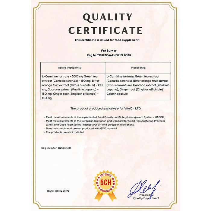 Zaufanie naszych klientów jest naszym najwyższym priorytetem. Dlatego każdy produkt VitaOn jest wytwarzany zgodnie ze standardem Dobrej Praktyki Produkcyjnej (GMP), który stanowi złoty standard w branży. Gwarantuje to ścisłą kontrolę na każdym etapie – od doboru surowców po kapsułkowanie i pakowanie. Dodatkowo, dla zapewnienia autentyczności i bezpieczeństwa, nasz Fat Burner jest zarejestrowany w Bułgarskiej Agencji Bezpieczeństwa Żywności (БАБХ) pod numerem rejestracyjnym T032304441. Z nami otrzymujesz produkt, co do którego jakości, czystości i skuteczności jesteśmy całkowicie pewni.