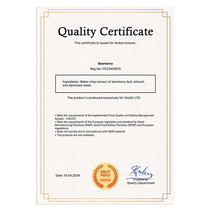 Produkty VitaOn powstają zgodnie z zasadami Dobrej Praktyki Produkcyjnej (GMP) – złotego standardu w produkcji suplementów diety. Nasza nalewka „Mącznica lekarska” jest wytwarzana z liści zbieranych w ekologicznie czystych górskich rejonach, aby zagwarantować wysoką koncentrację substancji aktywnych. Zaufanie klientów jest naszym priorytetem, dlatego każdy produkt posiada numer rejestracyjny P222400613, wydany przez Agencję ds. Bezpieczeństwa Żywności, potwierdzający jego jakość i autentyczność.