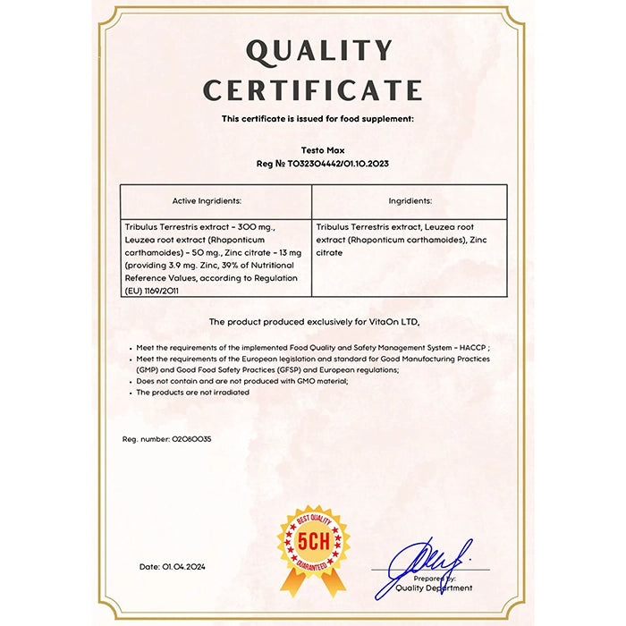 Zaufanie naszych klientów jest naszym najwyższym priorytetem. Dlatego „Testo Max” jest produkowany zgodnie ze standardem Dobrej Praktyki Produkcyjnej (GMP) – złotym standardem w branży. Gwarantuje to ścisłą kontrolę na każdym etapie – od wyboru surowców po gotowy produkt. Jako dodatkowa gwarancja autentyczności i bezpieczeństwa, produkt został zarejestrowany w Bułgarskiej Agencji Bezpieczeństwa Żywności (BABH) pod numerem rejestracyjnym T032304442.